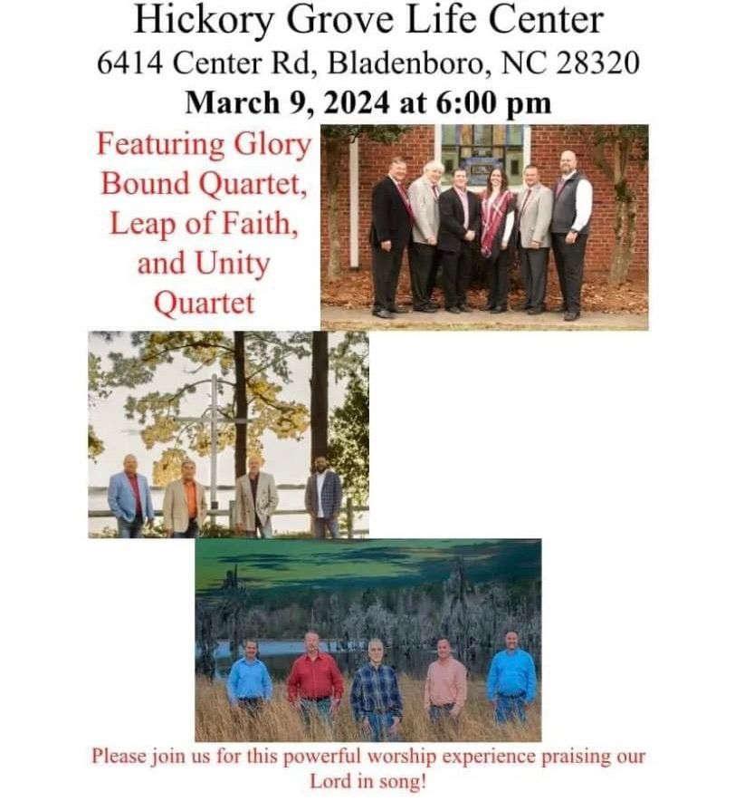 Everyone is invited to join us as we welcome Glorybound Quartet, Leap of Faith, and Unity Quartet. This event is free of charge and open to everyone!