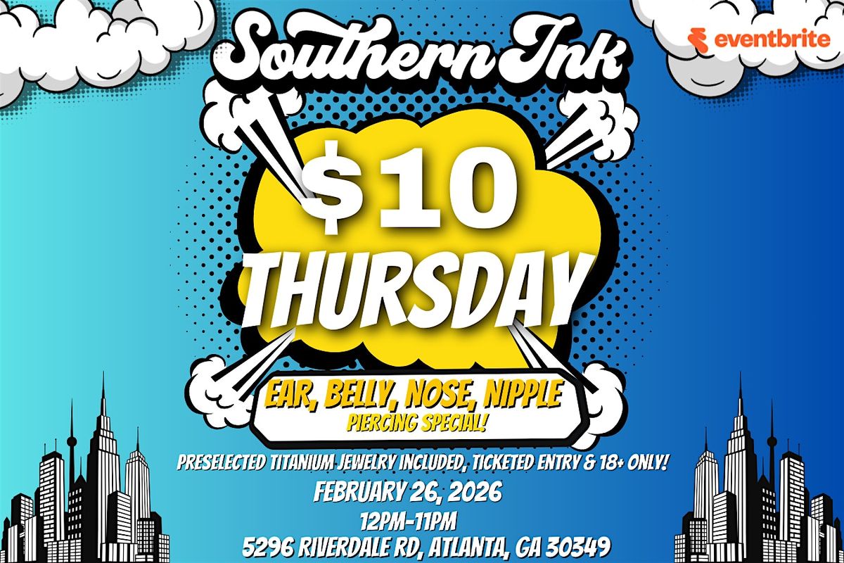 Welcome to Southern Ink, Atlanta! Join us for our special event: $10 Thursday piercing special happening on February 26, 2026 at 12:00 PM at Southern Ink, Atlanta: Tattoos and Piercings. Get ready for some amazing deals on piercings! Don't miss out on this opportunity to get a new piercing or add to your collection. See you there!