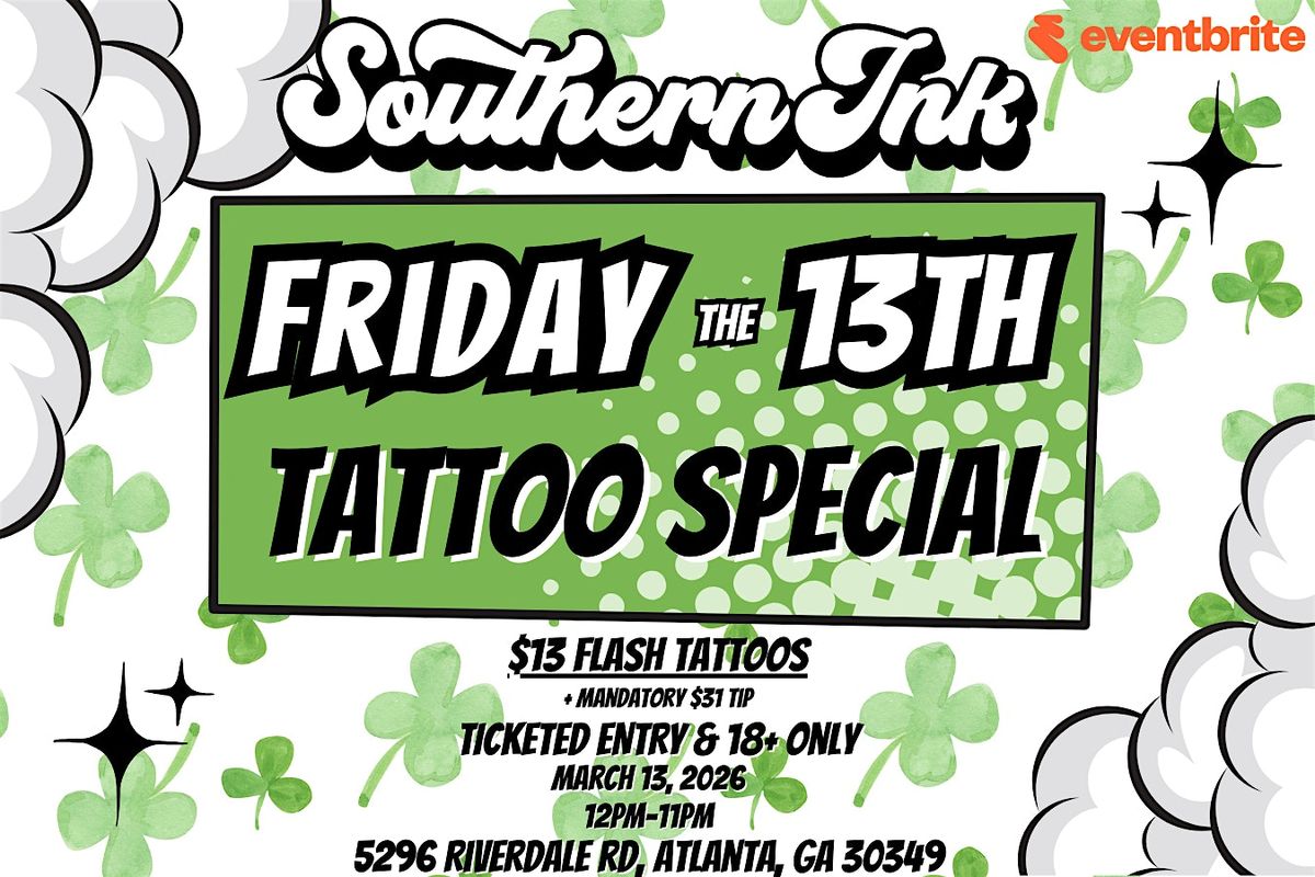 Welcome to Southern Ink Atlanta! Join us for this special event on Friday March 13th, 2026 at 12:00 PM at 5296 Riverdale Rd, Atlanta, GA 30349. Get ready for some amazing deals on Tattoos! Don't miss out on this opportunity to get a new Tattoo and/or add to your collection. See you there!