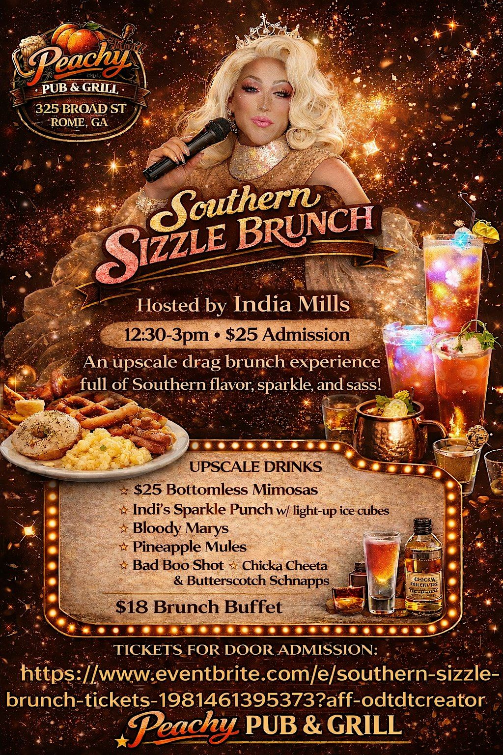 Join us for a fabulous brunch buffet just $18 per person, hosted by the stunning India Mills of the Sizzling Sisters of Rome. Expect fierce performances, high-energy entertainment, and a stylish Southern twist.