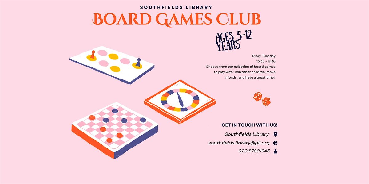The club runs from 16:30 to 17:30 and is managed by our library volunteers. It is intended for children between the ages of five and twelve. You do not need to bring your own boardgames to join us, however, we ask all customers to be respectful of library property and the other visitors.