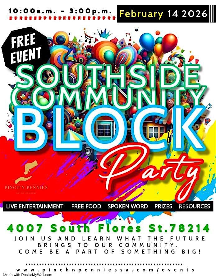 Show the Southside some love this Valentine's day by moving your body, feeding your spirit, and investing in the future of our community! Join us for a family-friendly Southside Community Block Party, a high-energy wellness, empowerment, and community experience as part of Pinch'n Pennies at the corner of S. Flores and Pleasanton.