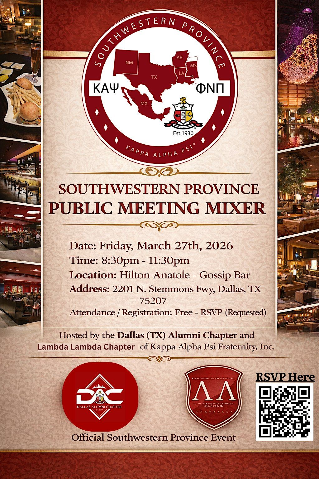 Join us for the Southwestern Province Public Meeting Mixer at the Hilton Anatole - Gossip Bar. This evening gathering provides an opportunity for brothers, guests, and community members to connect in a welcoming and engaging environment during the 90th Southwestern Province Council Meeting weekend.