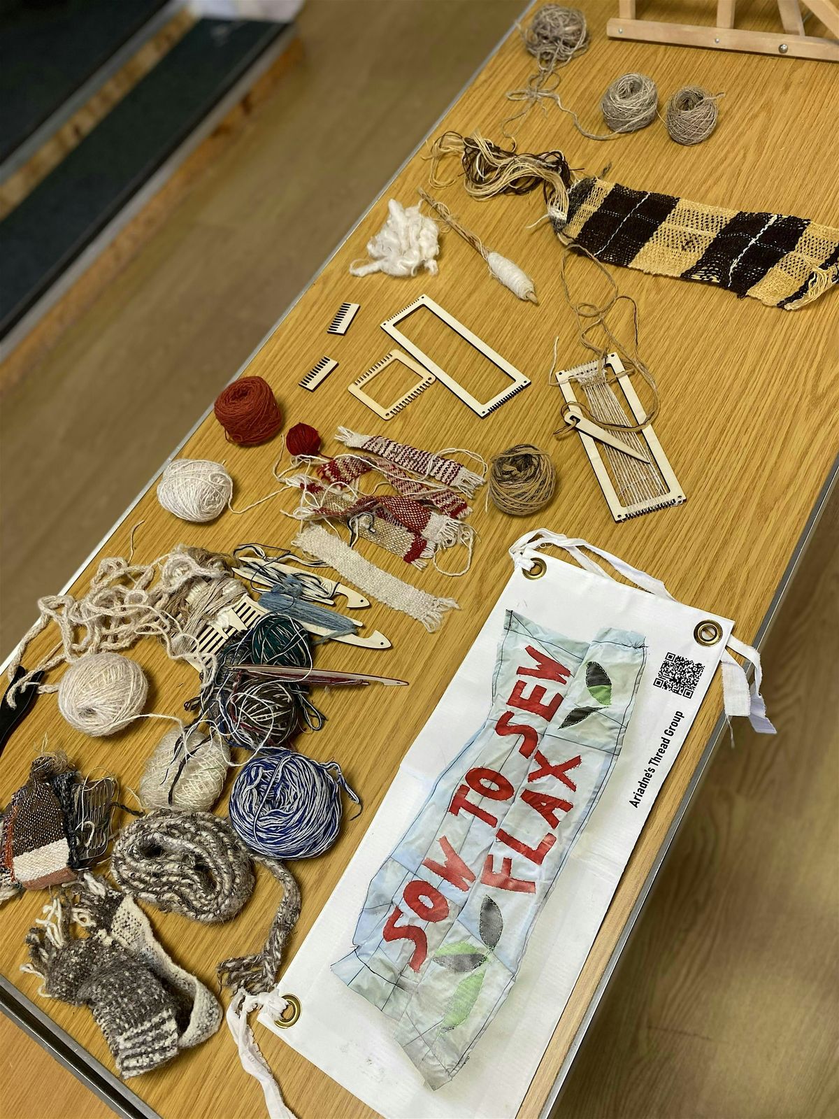 This is the final stage of our annual flax growing project which involves using up leftover yarns and other fibres from our previous harvests.
