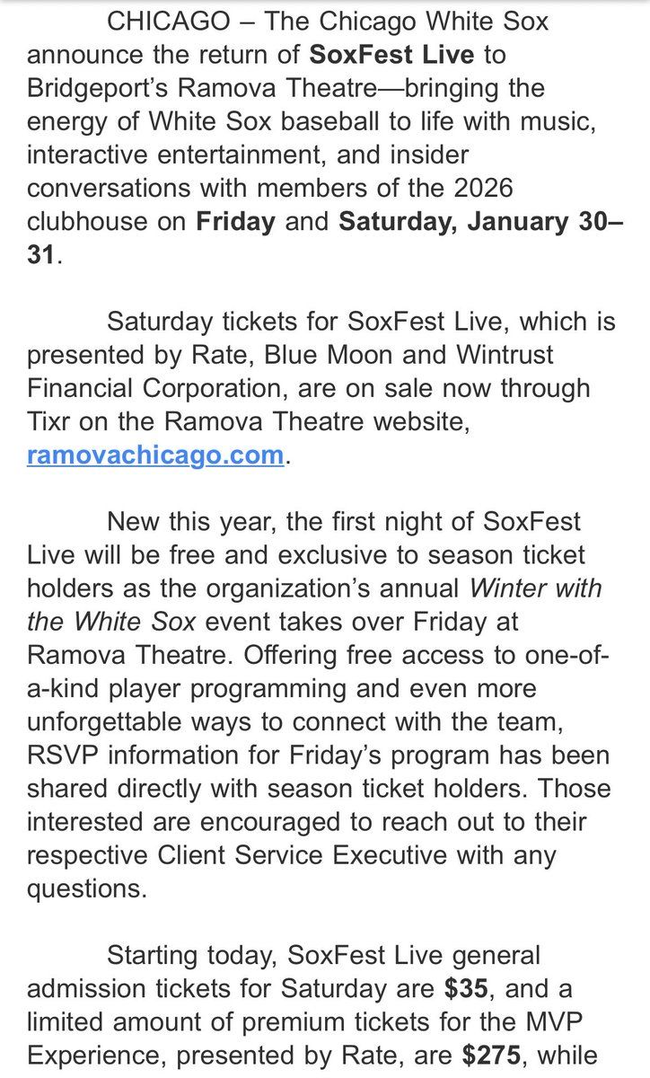 ✨ Discover the extraordinary at Soxfest, where magic meets reality in ways you've never imagined! 🏛️ Set in Ramova Theatre nestled in bustling Chicago, IL, this event promises to be a landmark occasion. 📅 Taking place on January 30th, 2026 at 06:00 PM, it's going to create an atmosphere where every moment becomes a cherished memory. 🌟 Immerse yourself in an experience crafted with attention to every detail, designed to surprise and delight at every turn. They have worked tirelessly to ensure this event exceeds all expectations, bringing together elements of entertainment, innovation, and pure joy. 🎊 Don't miss your chance to be part of this remarkable journey!http://maps.seatics.com/GeneralAdmissionEvent_2021-07-08_1018_11272024_093231_SVGC_tn.png