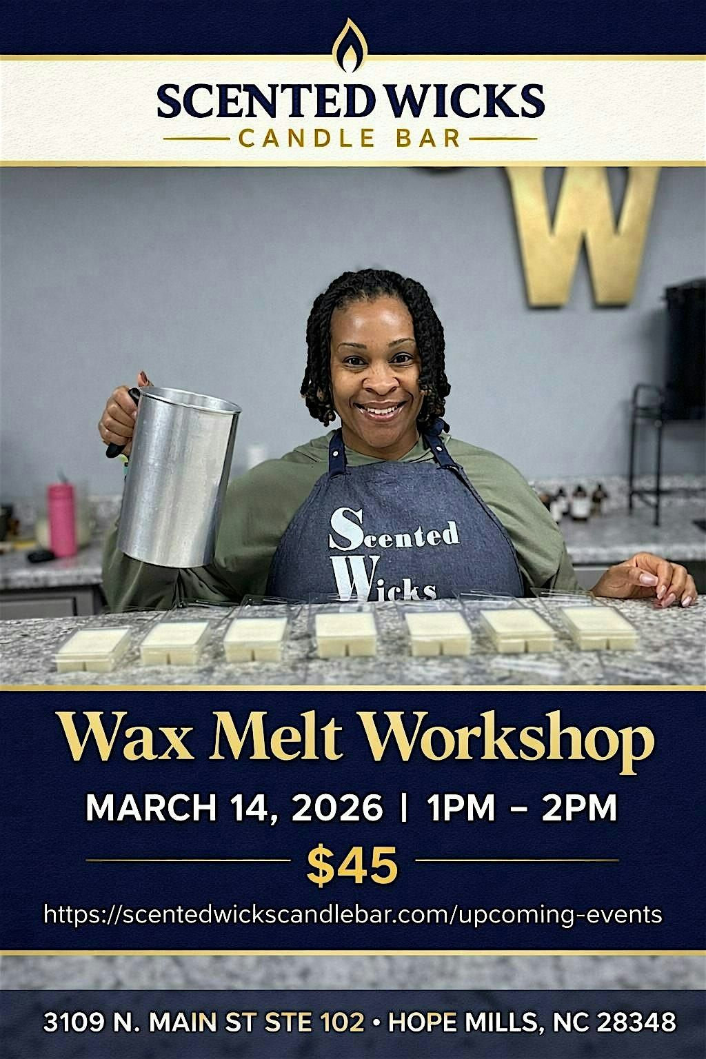 Join us at Scented Wicks Candle Bar for a fun and hands-on Soy Wax Melt Workshop! During this interactive experience, you’ll create your own custom-scented soy wax melts from startEach guest will leave with beautifully crafted, highly fragrant soy wax melts ready to enjoy at home or gift to someone special.All materials included