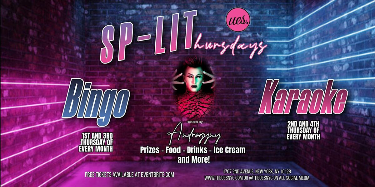 Come to the UES for our all new Thursday event: SP-LIT Thursdays!!! The first and third Thursday of every month we will be having our Bingo Tournament with prizes galore. The second and fourth thursday of every month join us for Karaoke and belt to your hearts content. All hosted by our Queen Androgyny. We have shots, drinks, food, ice cream, games and more. Tickets are free so be sure to book now!