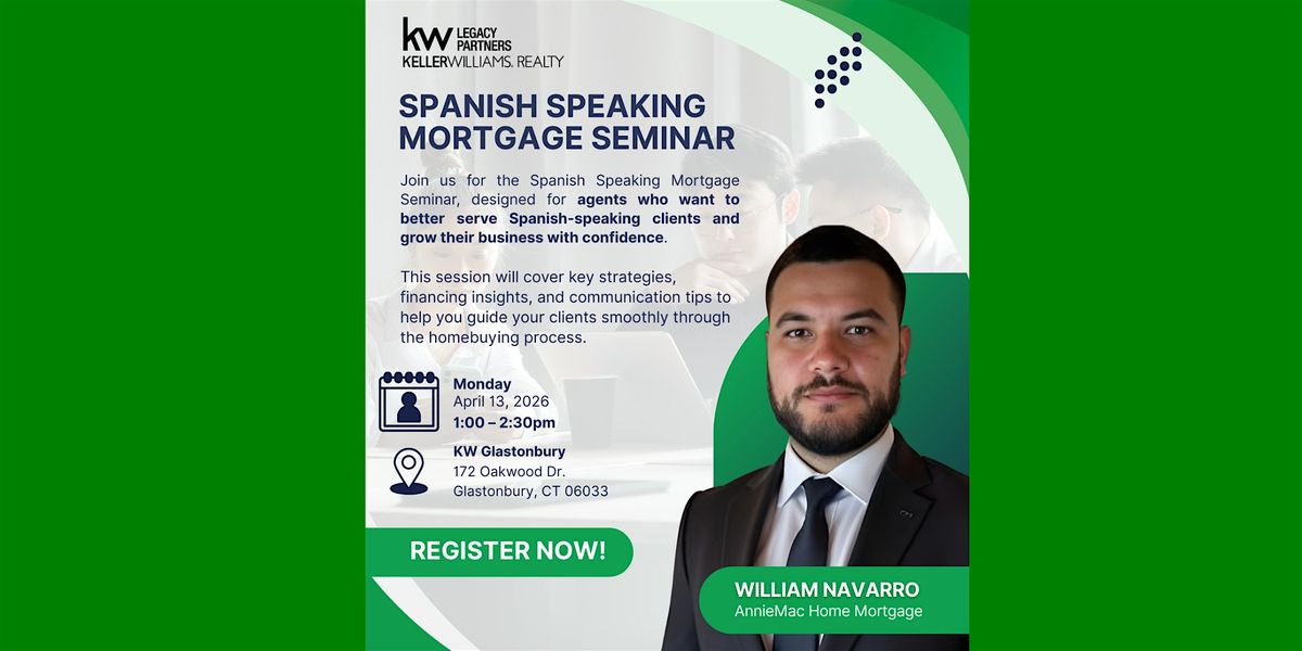In this informative session, William Navarro, Mortgage Loan Originator (NMLS# 1828495) with AnnieMac Home Mortgage, will walk you through key insights on working with Spanish-speaking buyers, including communication strategies, financing options, and how to confidently guide your clients from consultation to closing.