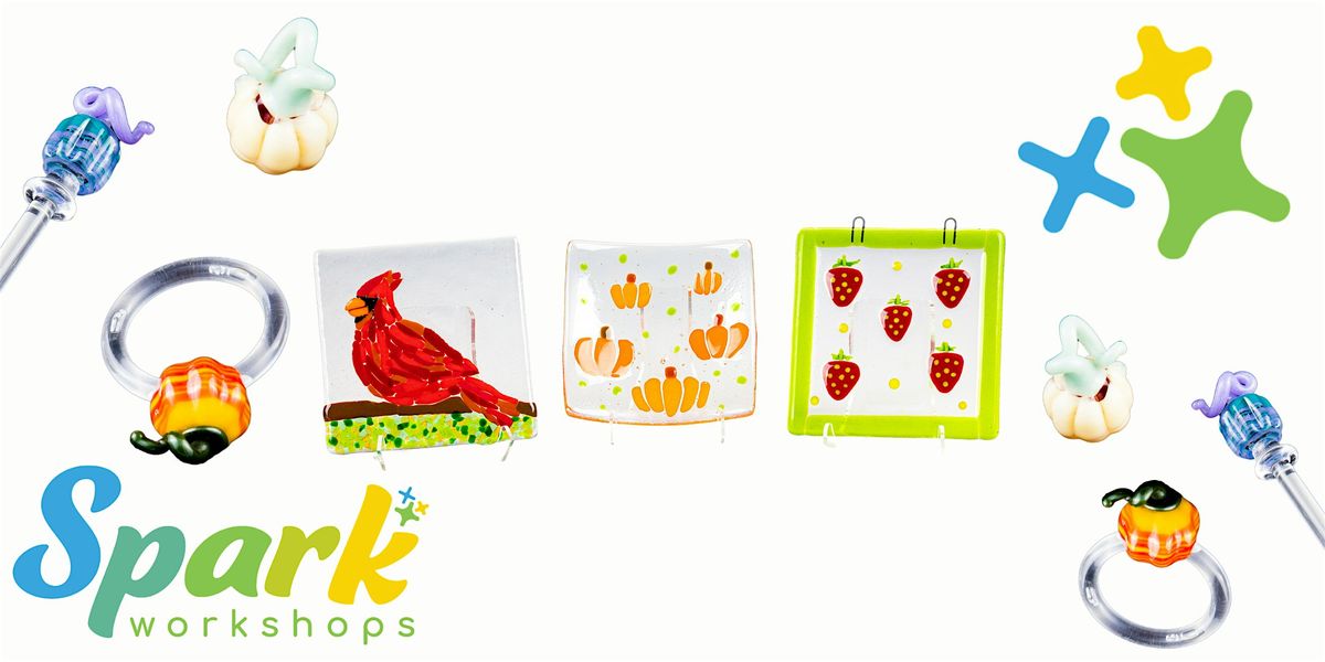 Spark Workshops are the best way to experience the joy of working with glass! Projects vary and may be seasonally themed. You pick your colors and manipulate the glass to create your one-of-a-kind glass treasure.
