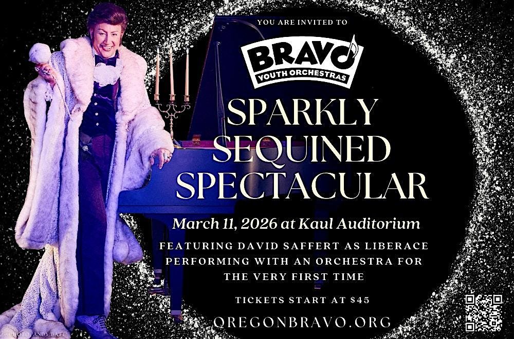 BRAVO is throwing a party at the beautiful Kaul Auditorium at Reed College with the one and only Mr. Showmanship himself, Liberace! Ok. Not the real Liberace. (He died back in 1987.) Our Liberace is Portland’s own David Saffert. When David isn’t playing piano for the Portland Gay Men’s Chorus, hosting a sing-along piano bar, releasing albums, performing on All Classical, or one of his countless other piano endeavors, he can be seen performing all across the country as Liberace. His attention to detail, witty and humorous stage persona, and spectacular piano performance has David in demand in venues from coast to coast.