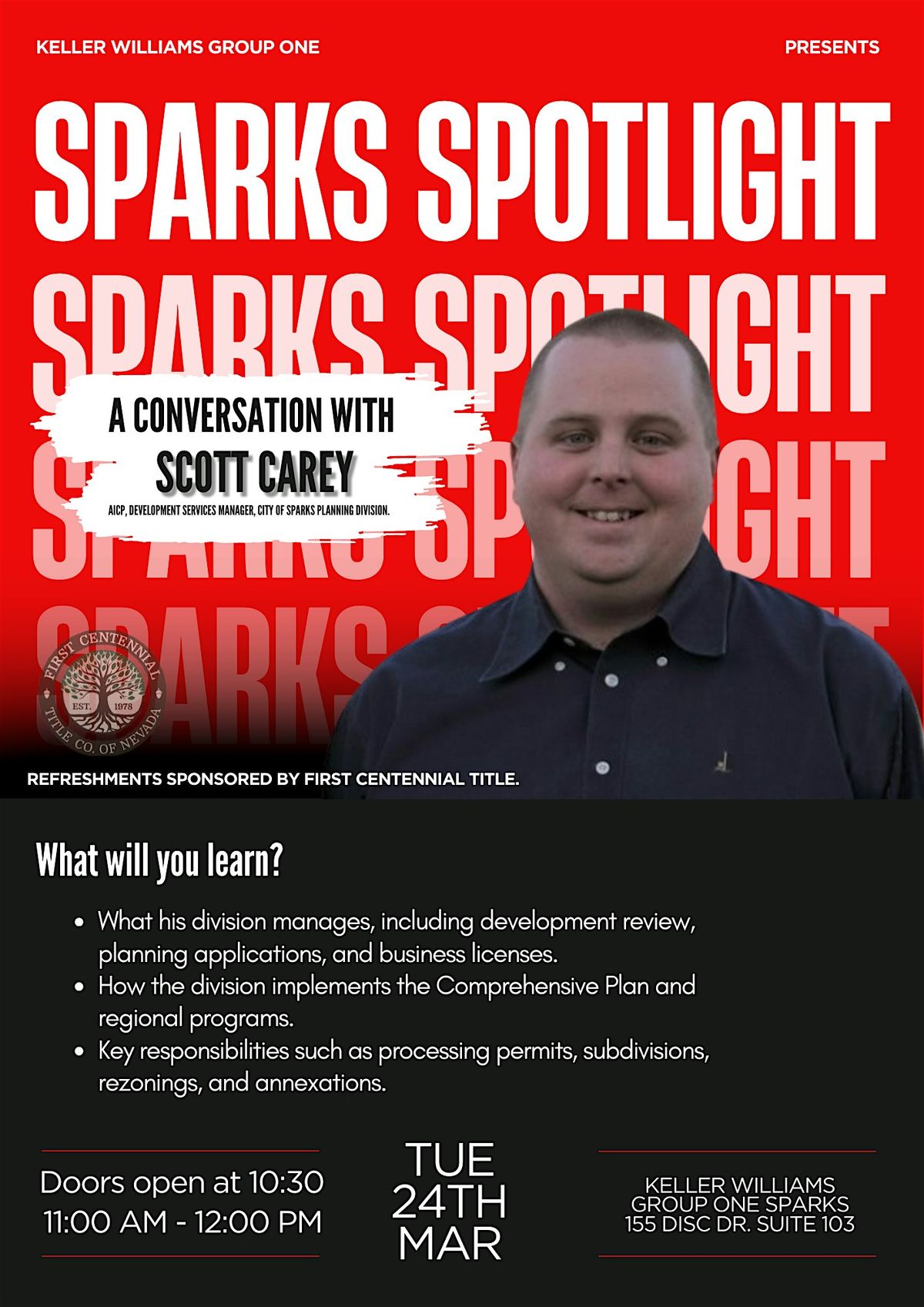 Join us in person for an exciting session featuring Scott Carey, the City of Sparks Planner! Get the inside scoop on what's happening in Sparks and how the city is shaping its future. Whether you're a local or just curious, this is a great chance to connect, learn, and get involved. Don't miss out on this engaging community event!