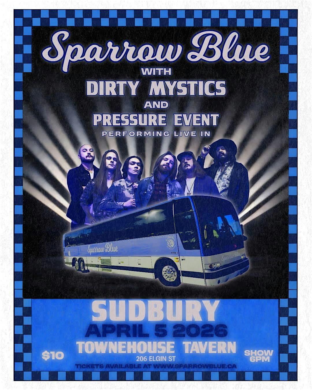 Get ready for a night of incredible rock music with international touring band SPARROW BLUE as they return to SUDBURY on their BIG BLUE 2026 TOUR with amazing guests DIRYT MYSTICS and PRESSURE EVENT!