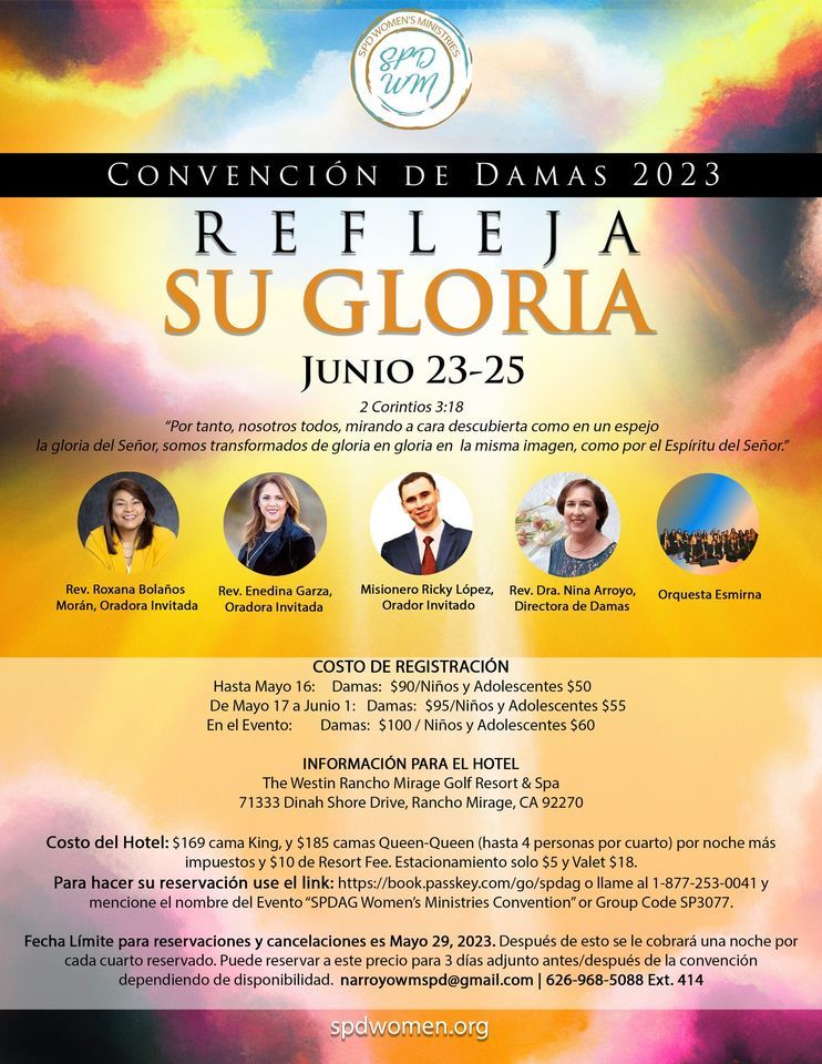 Martes 16 de Mayo: Registración $90 por dama, $50 por niño y adolescente. Para el Pastor Principal de SPD, $50. (Solo uno por iglesia. Se requiere una copia de la credencial del Pastor. Si registra a 12 damas antes de ésta fecha, la Coordinadora NO PAGA REGISTRACIÓN. Miércoles 17 de Mayo al 1 de Junio: El costo es de $95 por dama y $55 por niño y adolescente. Luego de esta fecha no se recibirán mas registraciones en la oficina, tendrá que registrarse el día de la Convención y el costo