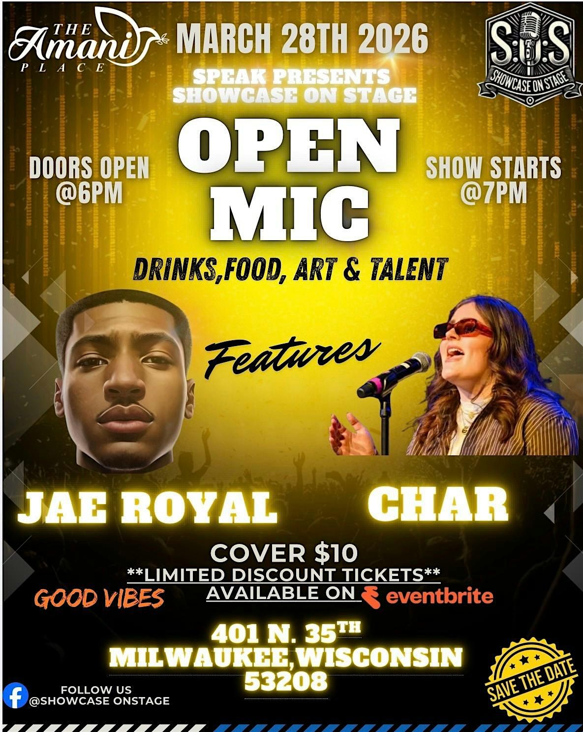 Welcome to the SPEAK PRESENTS SHOWCASE ON STAGE event! Get ready for an exciting evening filled with amazing performances at 401 N 35th St. Join us on March 28, 2026 at 7:00 PM (Central Time) for a night to remember. Don't miss out on this fantastic showcase!