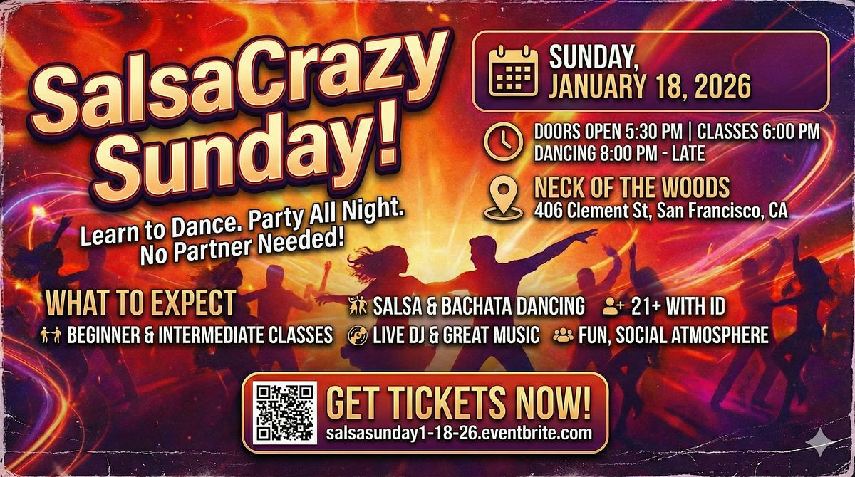 Join us for a Rare Special Event - SalsaCrazy Sunday - where you can learn to Salsa dance AND dance salsa & bachata at a great night club!