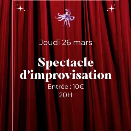 Ce qui t'attend 🔥 Des scènes entièrement improvisées, créées en direct devant toi 😂 Un humour spontané et interactif porté par des comédiens sans filtre 🎯 Un spectacle différent à chaque représentation, où tu fais partie du jeu Infos 📅 Date : jeudi 26 mars à 20h ⏳ Durée : 2h30 📍 Lieu : Le Quartier du Poulpe - 34 Bd Auguste Raynaud, 06100 Nice ♿ Accessibilité : Accès PMR Description Prépare-toi à une soirée où rien n’est écrit et tout peut surgir. Avec Impro Niss’art, les comédiens montent sur scène sans filet et créent sous tes yeux des situations imprévisibles, drôles et totalement uniques. Chaque réplique naît en direct, portée par ton énergie et celle de la salle. Ambiance chaleureuse, rythme effréné, éclats de rire garantis. Ici, l’imprévu devient spectacle et chaque représentation réserve son lot de surprises. Achète tes billets !