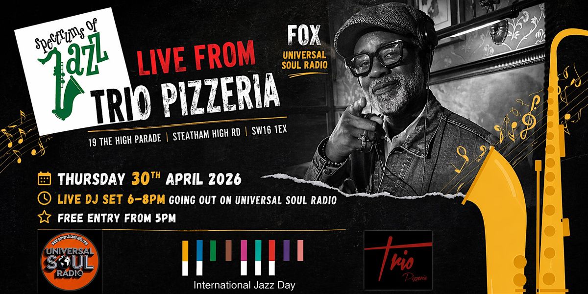 On International Jazz Day [Thursday 30th April 2026], Spectrums of Jazz steps out of the airwaves and into the room. Broadcasting live from Trio Pizzeria, Fox (Universal Soul Radio) curates a warm, soulful journey through jazz, rare grooves, and deep musical textures - the kind that stay with you long after the night ends.