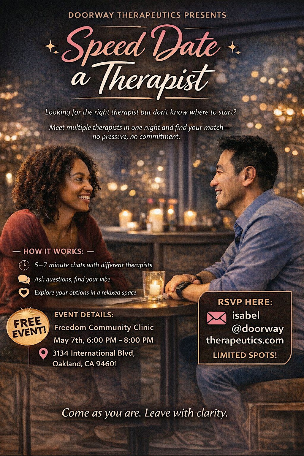 Looking to connect in a fun, relaxed way To connect with a new therapist? Join us at Freedom Community Clinic on May 7, 2026 at 6:00 PM (Pacific Time) for Speed Date A Therapist! It’s a cool chance to meet therapists one-on-one, ask questions, and see who vibes with you. Whether you’re curious about therapy or just want to chat, this event’s all about making connections without the pressure. Don’t miss out on this unique, casual hangout!