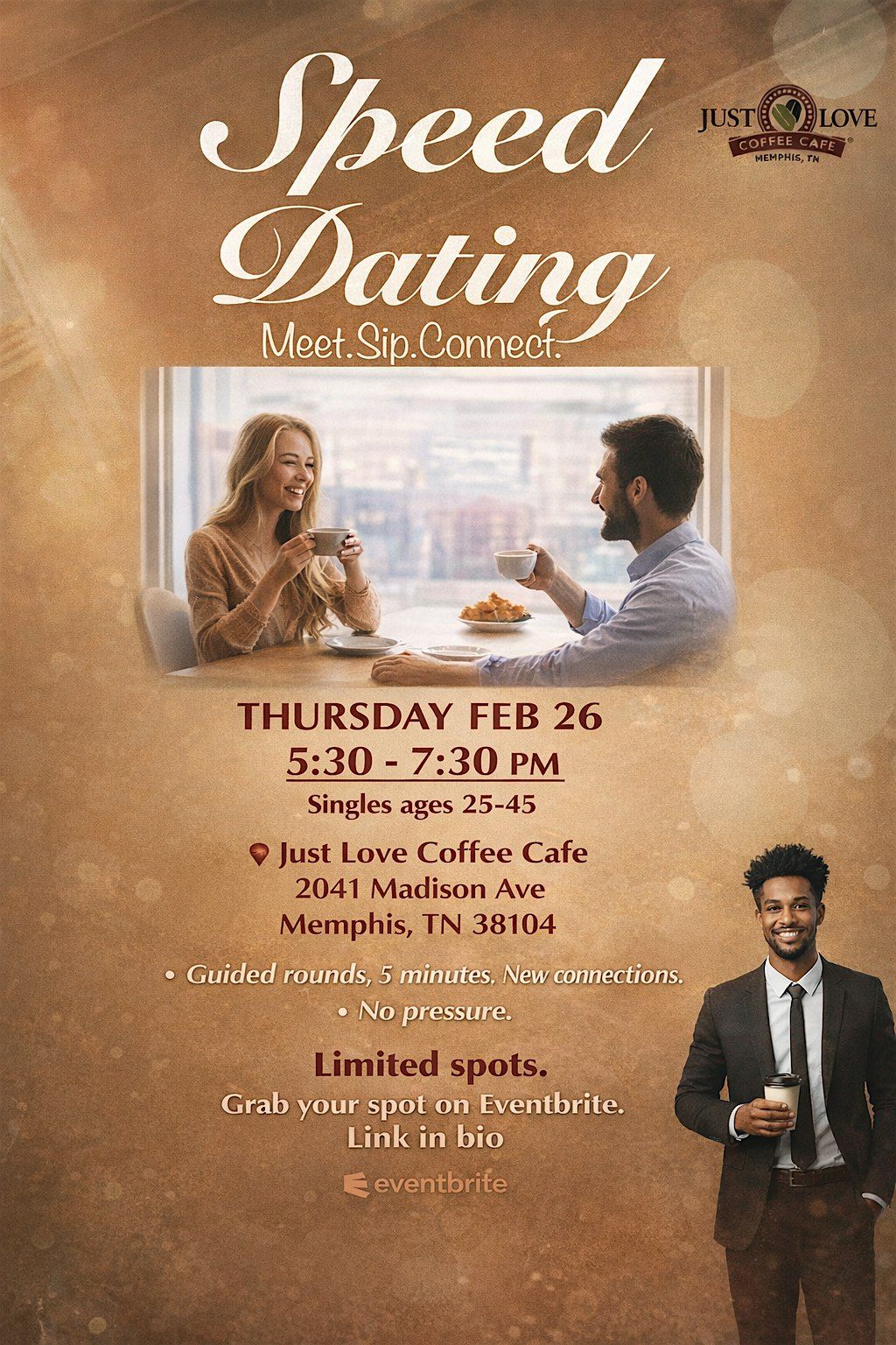 Looking to meet new people and have fun? Join our speed dating event at the cozy Just Love Coffee & Cafe Memphis. It’s a chill, in-person meetup where you can chat and connect over great coffee. Perfect for singles aged 25-45 ready to mingle and find a spark in a relaxed setting. Don’t miss out on this awesome chance to make new friends or maybe even find your match!