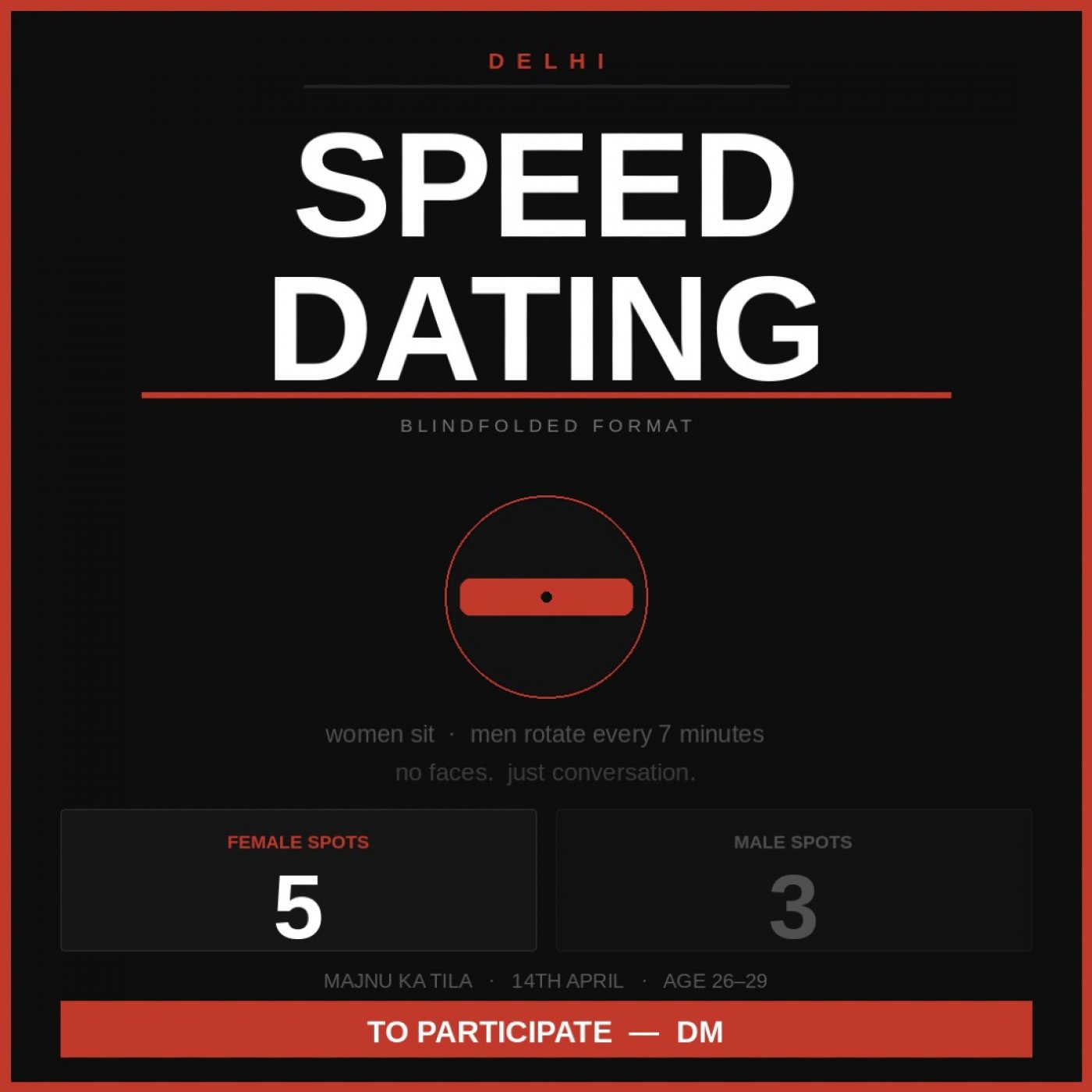 The Details Date: 14th April 2026 Time: 4:00 PM to 6:00 PM Venue, Majnu Ka Tila, New Delhi Age: 26 to 29 Capacity: 15 male, 15 female -strictly equal Ticket: Rs. 543 includes 1 burger with fries, spring roll, and a mojito