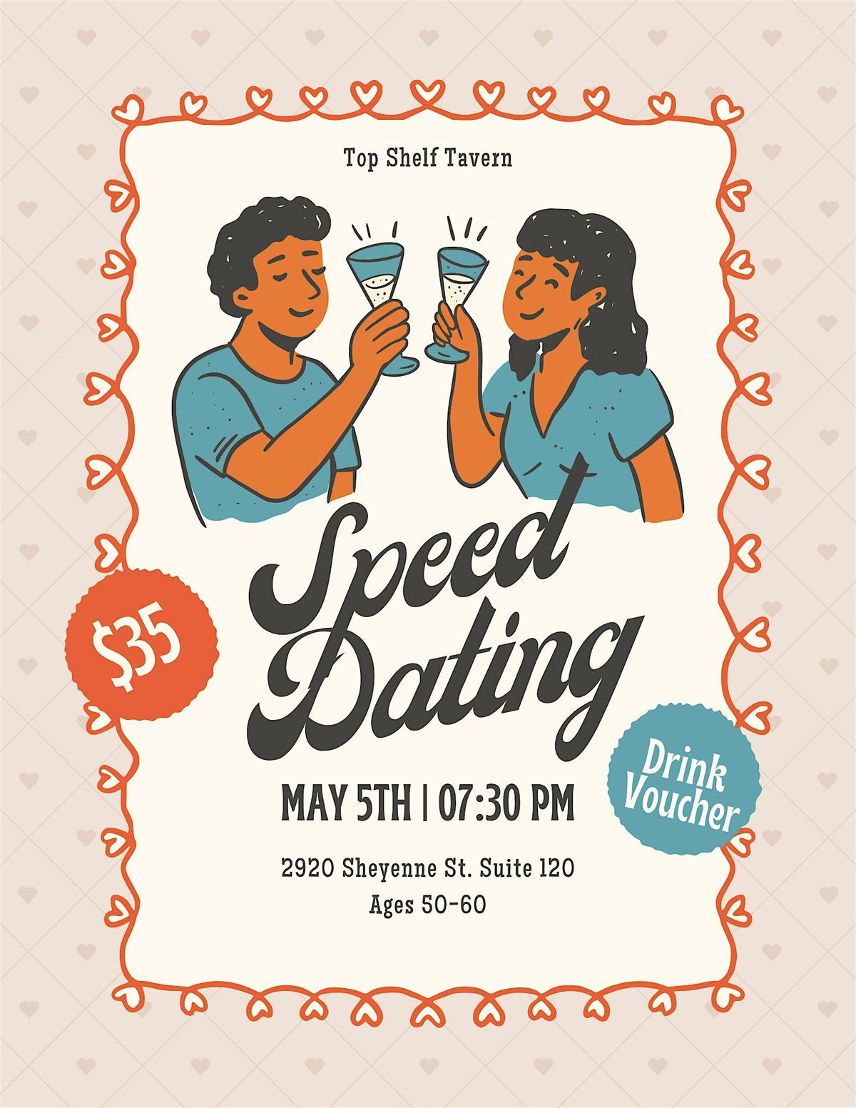 Speed Dating is your perfect chance to connect in person with fun, like-minded singles. Put on your best smile, bring your confidence, and enjoy a relaxed night filled with quick chats and new vibes. Whether you're looking for friendship or romance, this event is all about making genuine connections. Don’t miss out on a night of laughter, sparks, and maybe a little magic!