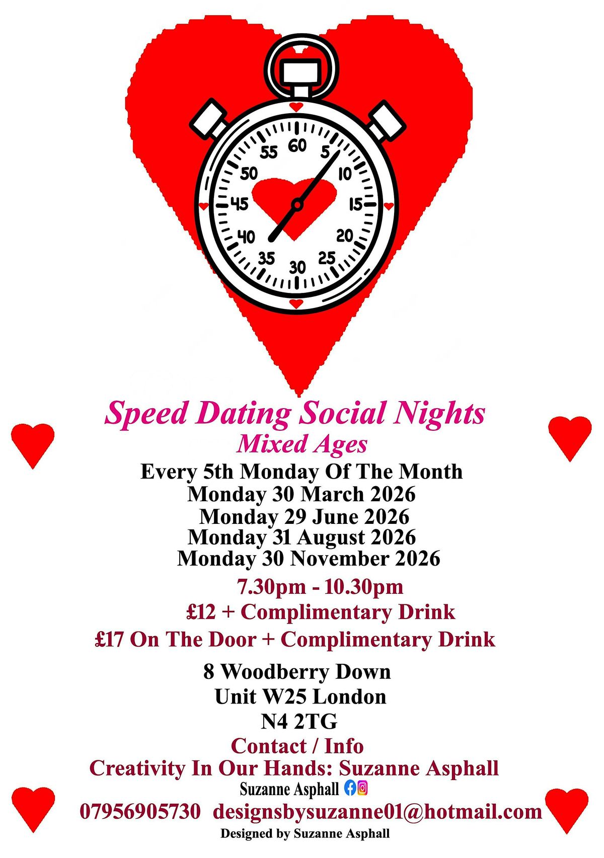 Speed Dating Social Nights. A social and musical evening, for those who love to listen and dance to music. To also meet people in a social environment. Taking place at Creativity In Our Hands: Suzanne Asphall. 8 Woodberry Down, Unit 25, N4 2TG.