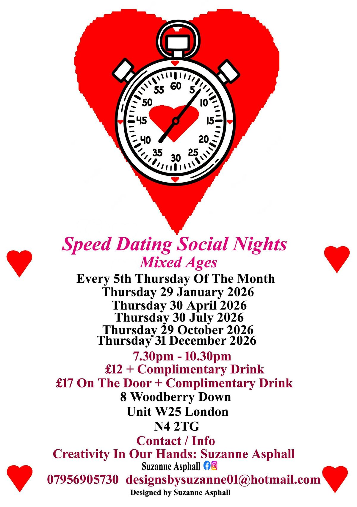 Speed Dating Social Nights. A social and musical evening, for those who love to listen and dance to music. To also meet people in a social environment. Taking place at Creativity In Our Hands: Suzanne Asphall. 8 Woodberry Down. Unit 25, N4 2TG.