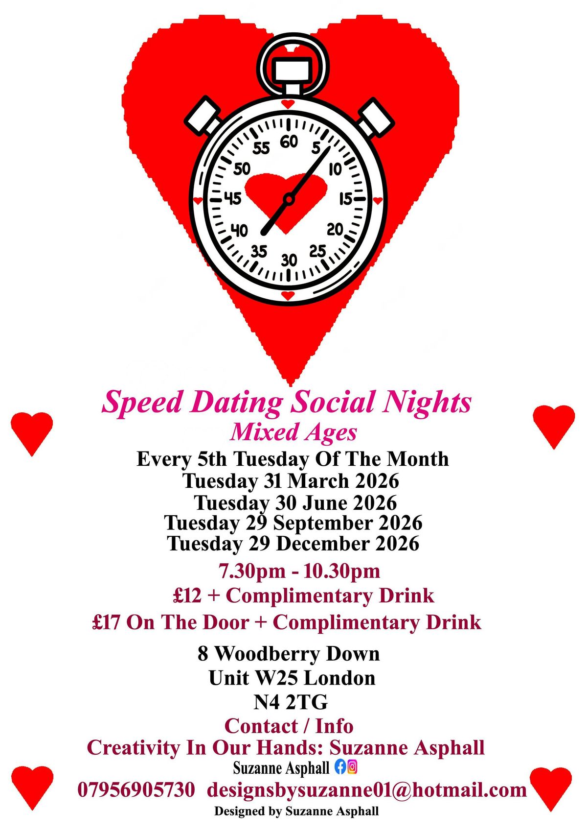 Speed Dating Social Nights. A social and musical evening, for those who love to listen and dance to music. To also meet people in a social environment. Taking place at Creativity In Our Hands: Suzanne Asphall. 8 Woodberry Down. Unit 25, N4 2TG.