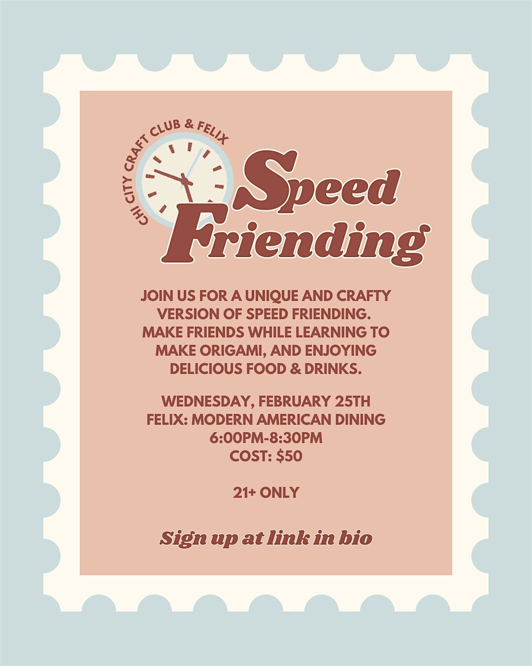 Come join us fora craft spin on Speed Friending at Felix: Modern American Dining on February 25, 2026 at 6:00 PM (Central Time)! It's the perfect opportunity to meet new people in a fun and relaxed atmosphere. Get to know new people while practicing Origami.