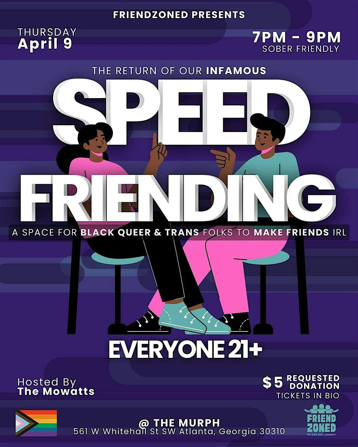 We’re back and better than ever! FriendZoned's Black Queer Speed Friending has returned with a fresh new vibe in an exciting new space. Now in a sober setting, our revamped Speed Friending is the perfect opportunity to make meaningful, platonic connections. Whether you're new to the city or a local looking to refresh or expand your friend circle, this event is for you!