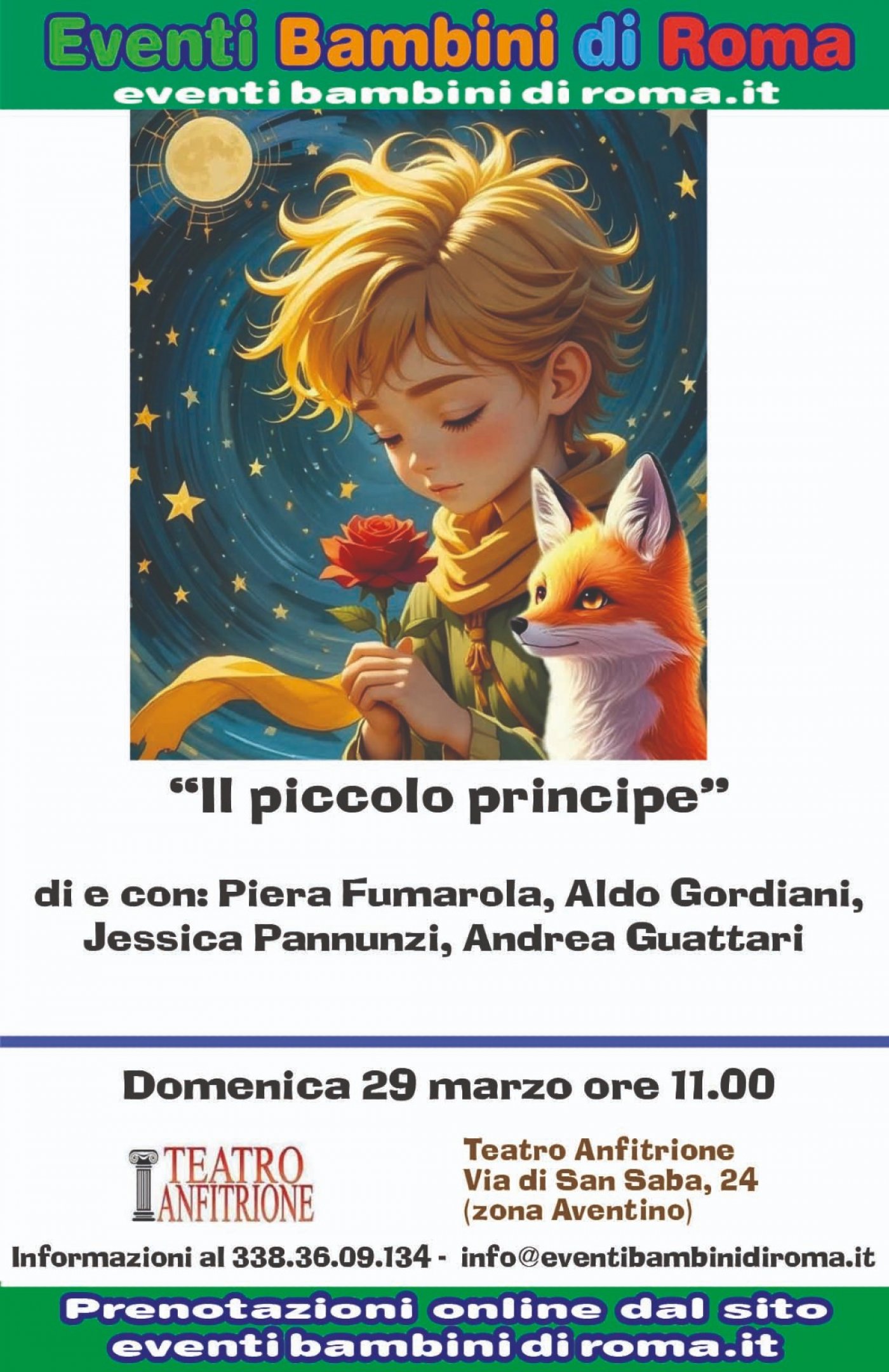 Domenica 29 marzo alle 11 al teatro Anfitrione (via di S. Saba, 24) ci sarà lo spettacolo “Il piccolo principe” di e con: Piera Fumarola, Aldo Gordiani,