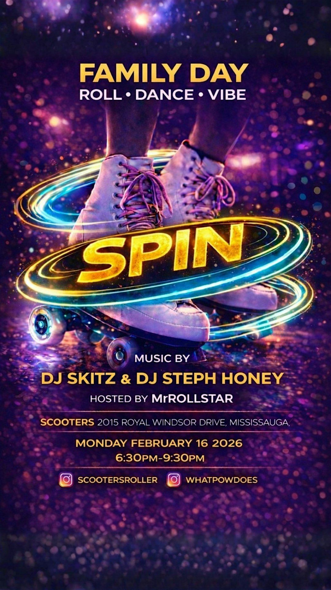 Monday Feb 16th, 2026 Scooter’s Roller Palace Mississauga 2105 Royal Windsor Drive Skate from 6:30pm - 9::30pm