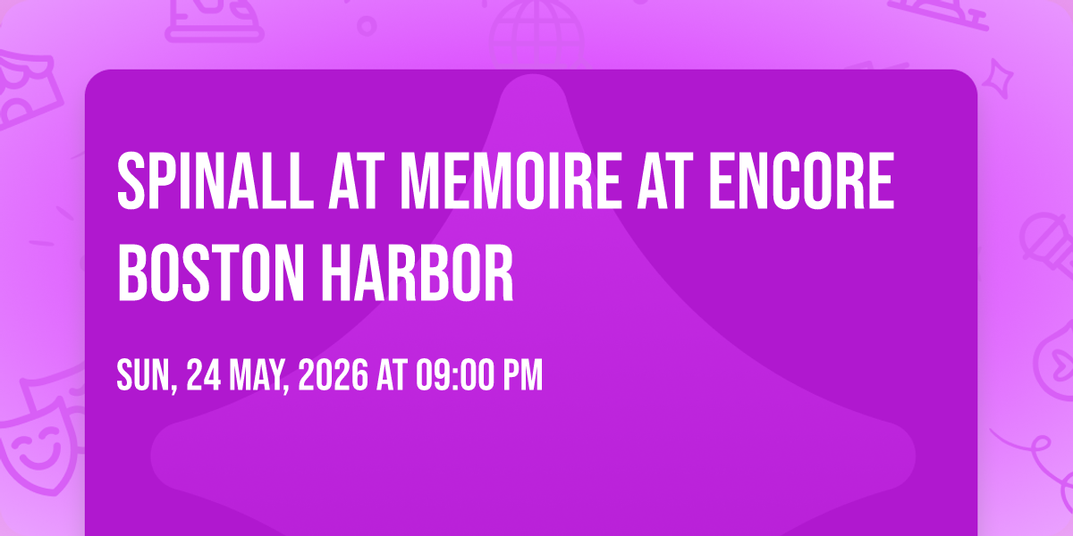 π Be part of history at Spinall at Memoire at Encore Boston Harbor, an extraordinary gathering that will captivate your imagination! ποΈ The prestigious Memoire at Encore Boston Harbor in Everett, MA sets the stage for an unforgettable experience on May 24th, 2026 at 09:00 PM. β¨ They are bringing together the finest elements of entertainment and innovation to create moments that will take your breath away. From the moment you arrive, you'll be immersed in an atmosphere of wonder and excitement. π― This carefully planned event ensures every guest experiences something truly special. π Early booking is recommended for this must-attend event of the season!