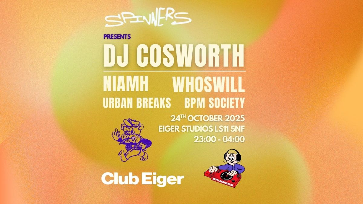 Spinners present Bristol heavyweight and Hardline label boss DJ Cosworth. Having last played in Leeds over 2 years ago, DJ Cosworth + support will provide an unmissable night of house, tech, funky and garage music! Joined by Leeds Royalty Niamh and Spinners front man whoswill, Eiger sees an exciting lineup of upcoming and established talent.