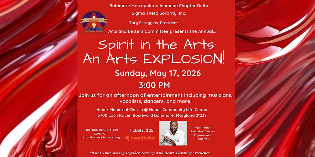 Come out to enjoy an afternoon of visual arts and performances with the Deltas of Baltimore Metropolitan Alumnae Chapter. Spirit in the Arts: An Arts Explosion! offers a variety of musical genres and art from Baltimore's best and brightest. All are welcome. You won't want to miss this EXPLOSION of the ARTS! There will be a dessert reception immediately following the program. Free parking is available.