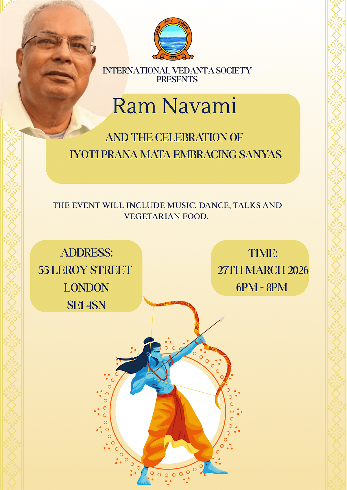 Join us for a special celebration honoring Ram Navami and the sacred occasion of Jyoti Prana Mata, founder of the International Vedanta Society UK branch, embracing sanyas—a profound step on the spiritual path.