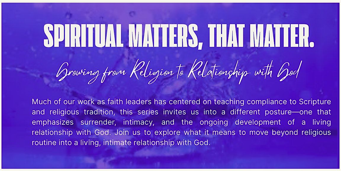 Get ready to dive deep into the world of spirituality and meaningful conversations at our in-person event, Spiritual Matters, That Matter. Whether you're curious or a seasoned seeker, this gathering is all about connecting, sharing, and exploring what truly matters to your soul. Don't miss out on a chance to explore what it means to move beyond religous routine into a loving, intimate relationship with God.