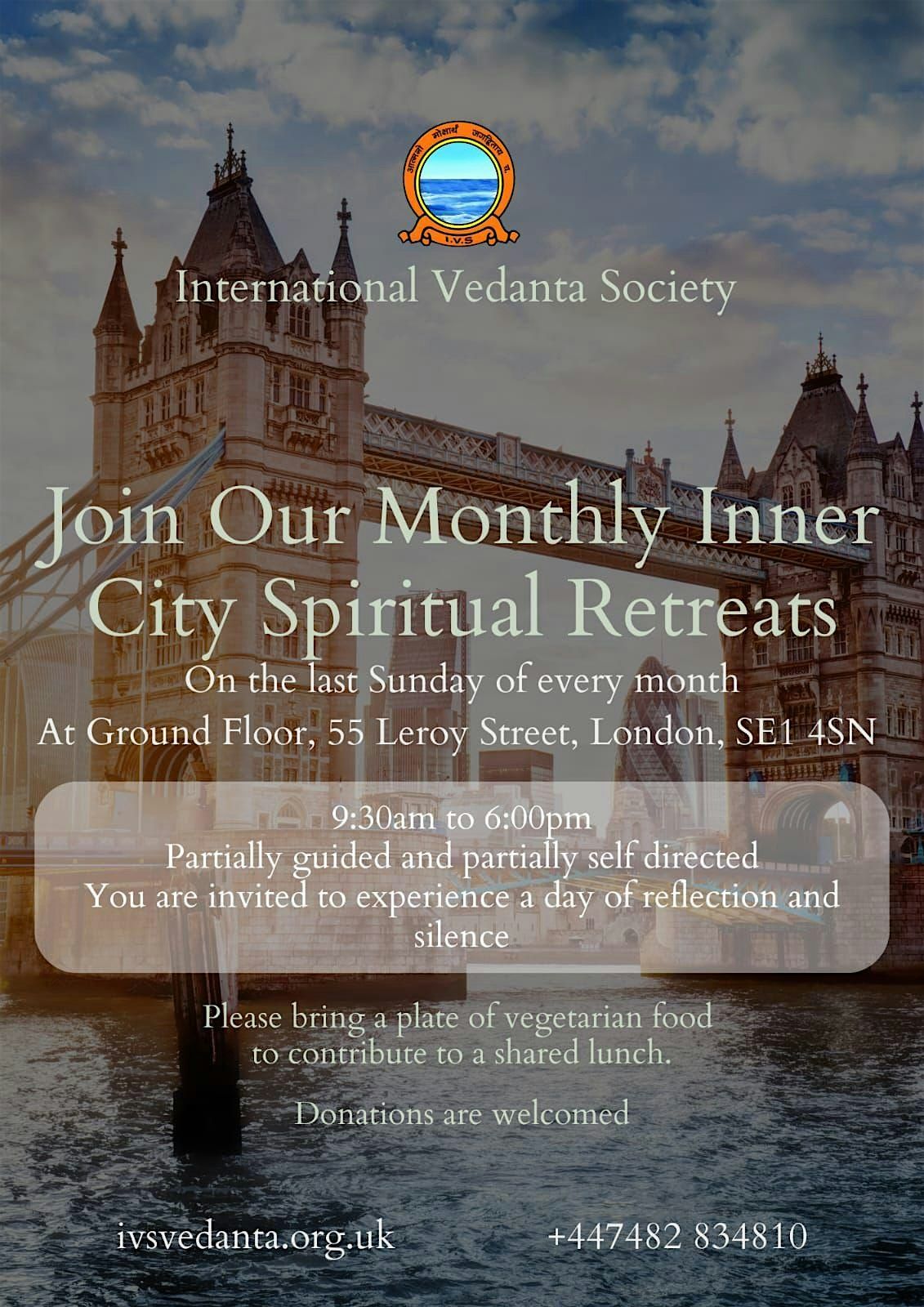 This one day retreat will be held at the International Vedanta Society Centre, based on Advaita Vedanta teachings by the founder Sri Sri Bhagavan. The day will be lead by the founder of the International Vedanta Society UK sanyassini, Jyoti Prana Mata. The day will include meditation, spiritual discussions, 1-1 spiritual guidance, mantra chanting, and a shared vegetarian lunch. Please bring a vegetarian dish of your choice.