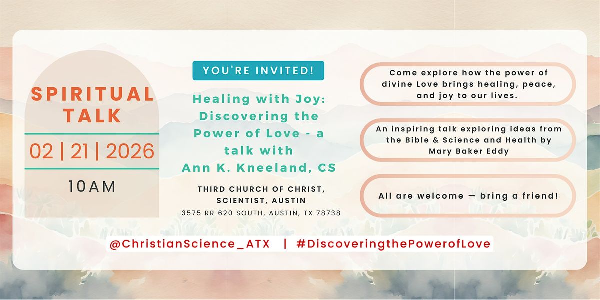 Join us for an inspiring Christian Science Spiritual Talk at Third Church of Christ, Scientist, Austin, exploring how divine Love brings healing, peace, and joy to everyday life.