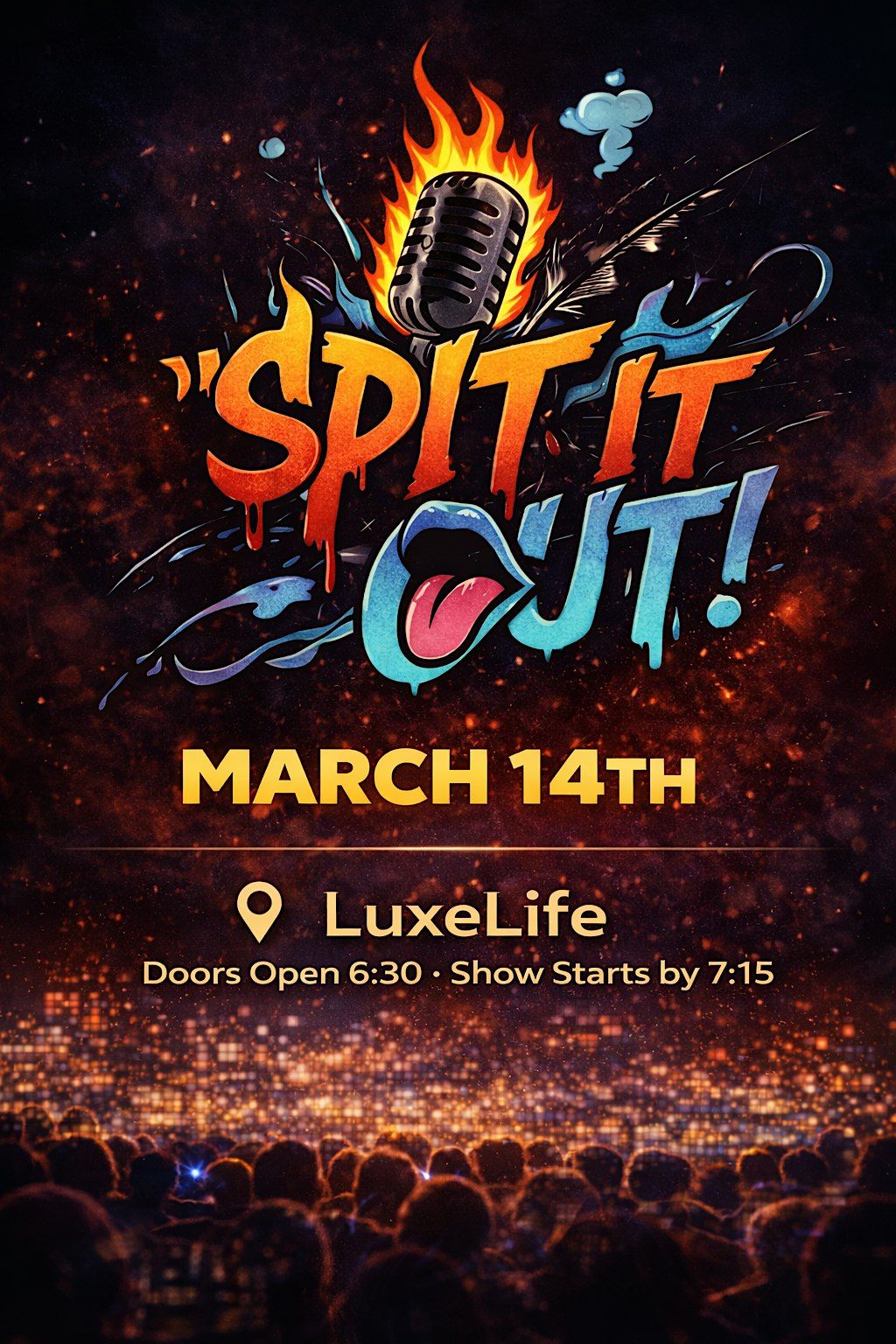 Welcome to Spit It Out! happening at Luxe Lounge on March 14, 2026 at 7:00 PM. Get ready for an evening filled with laughter, poetry, and music!
