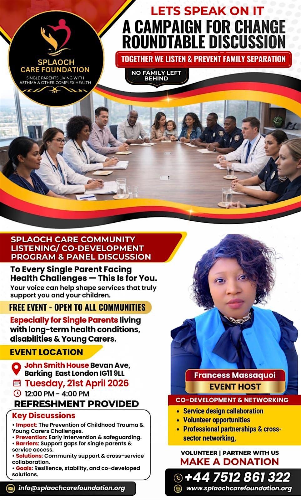 My name is Ms Francess H Massaquoi, Founder and Director of SPLAOCH Care Foundation, a community-led organisation dedicated to supporting single parents living with long-term health conditions or disabilities, along with their children and young carers.