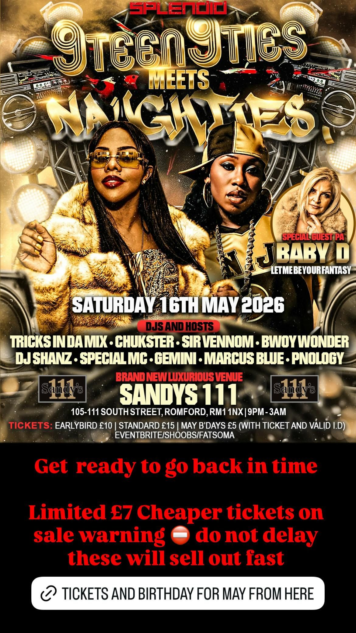 Delighted to announce that uk legend chart number one superstar Baby D will be performing for you live at this very special splendid 9teen9ties meets the naughties throwback special
