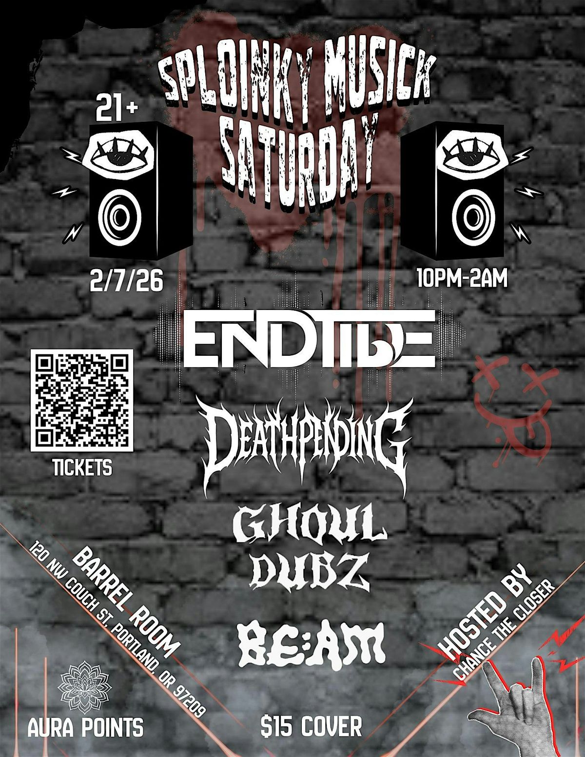 On 2/7/26, we’re taking over Barrel Room from 10PM–2AM with a full-send night of dubstep, riddim, and dark bass energy. Pull up for heavyweight sets from ENDTIDE, DEATHPENDING, GHOUL DUBZ, and BE:AM, hosted by Chance The Closer.