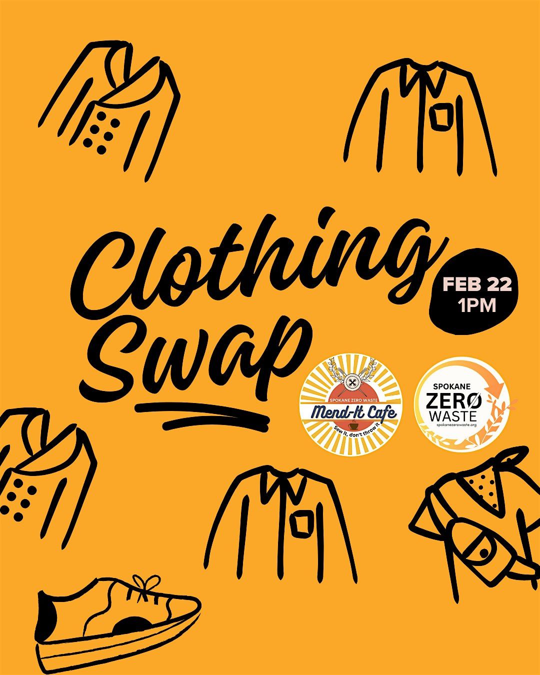 Hey Spokane! Ready to refresh your wardrobe without waste? Join us at the Spokane Zero Waste & Mend-It Cafe Clothing Swap for a fun, in-person event where you can swap up clothes, find great new-to-you styles, and give your old favorites a new life. It's all about reducing waste and supporting sustainable fashion in a casual, friendly environment. Bring your gently used clothes and leave with something fresh. Let’s swap, and make a difference together! Bring up to 5 clean, gently used men’s or women’s clothing items you no longer wear (no shoes or accessories). Drop off from 1–2pm, then shop the swap starting at 2pm and take home up to 5 “new-to-you” pieces.