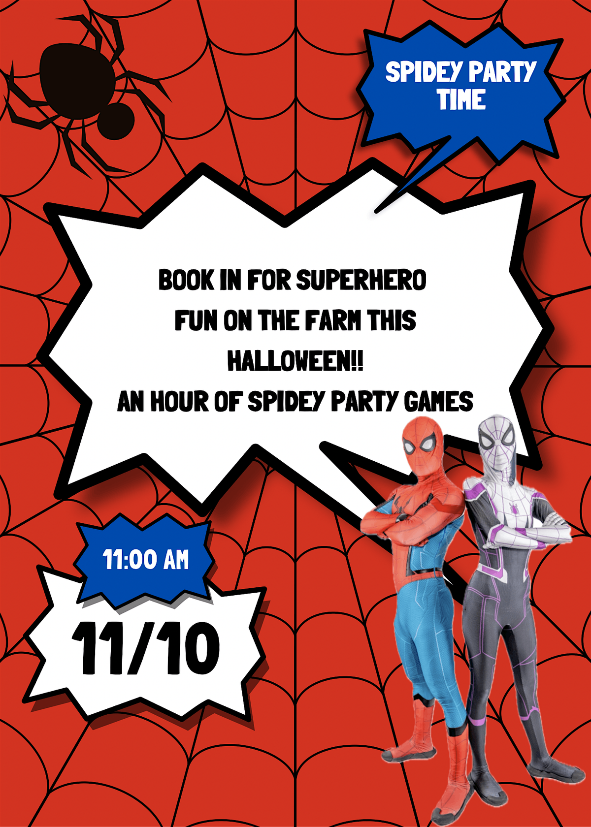 BOOK IN FOR SUPERHERO FUN ON THE FARM THIS HALLOWEEN!!AN HOUR OF SPIDEY PARTY GAMES