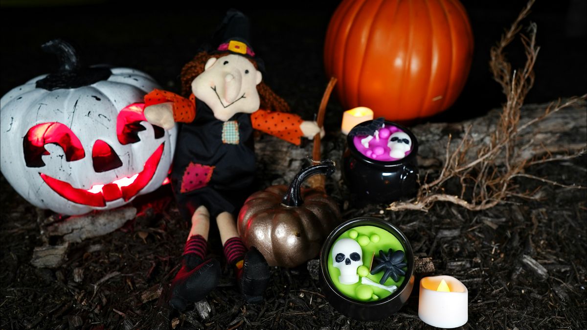 Start by choosing your type of candle wick to pair with your cauldron. Then start on making your candle potion! Choose from a variety of fall-inspired scents, burn-safe glitter and dyes to custom color your wax. Next, add some spooky "ingredients" to top off your potion. You can even make your candle GLOW IN THE DARK!