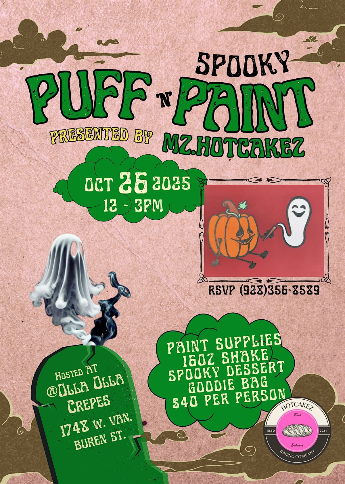 Get ready for a Halloween themed Puff n’ Paint! Dress in costume, puff, and paint a glowing pumpkin with ghostly smoke vibes. Whether you’re a beginner or a pro, this spooky session is perfect for unleashing your inner artist while enjoying a relaxed, 420 friendly night out.