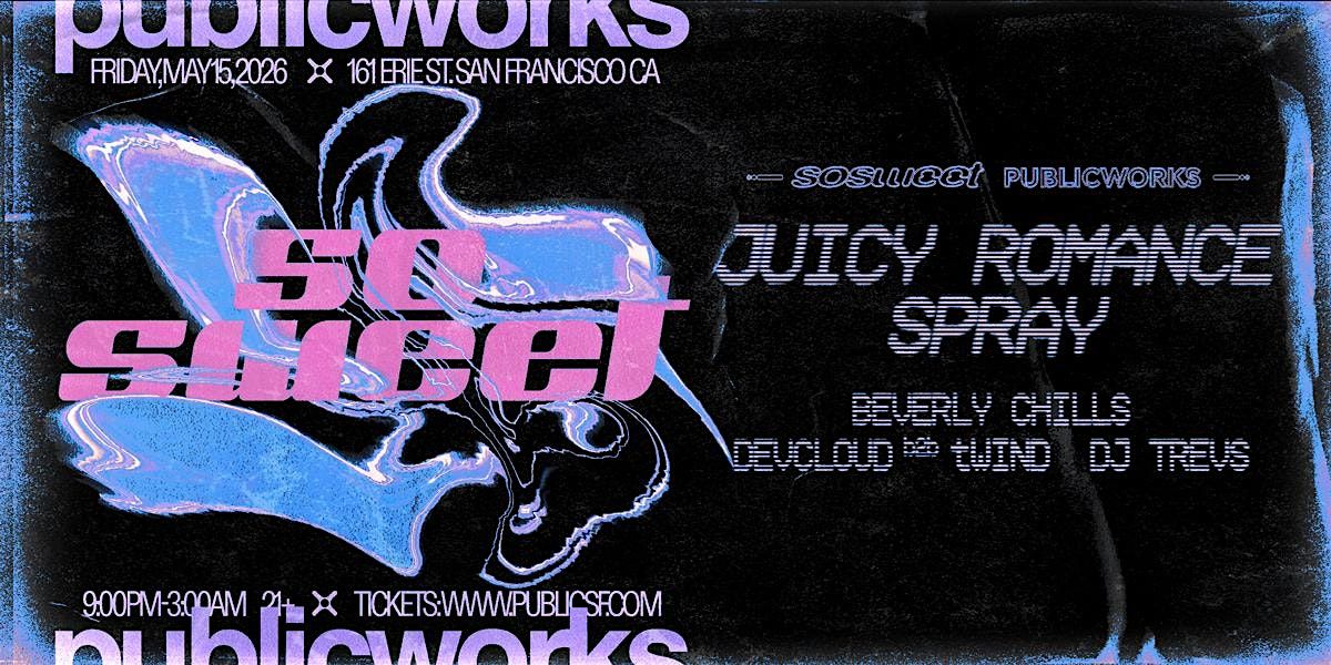 SPRAY, the ultimate effervescent dj, producer and label Head of Punctuality, will bring his dreamy chuggers to the table of Public Works Alongside Aussie dj wizard, Juicy Romance. Her Aussie flare of pop-turned club bangers , mixed with SPRAY's deep bag of productions are the perfect duo to host a proper club night on PW's massive four corner Funktion One system. Full throttle support by So Sweet’s finest and SF heads Beverly Chills and DJ Trev will generate the heat to keep the sway moving till late.