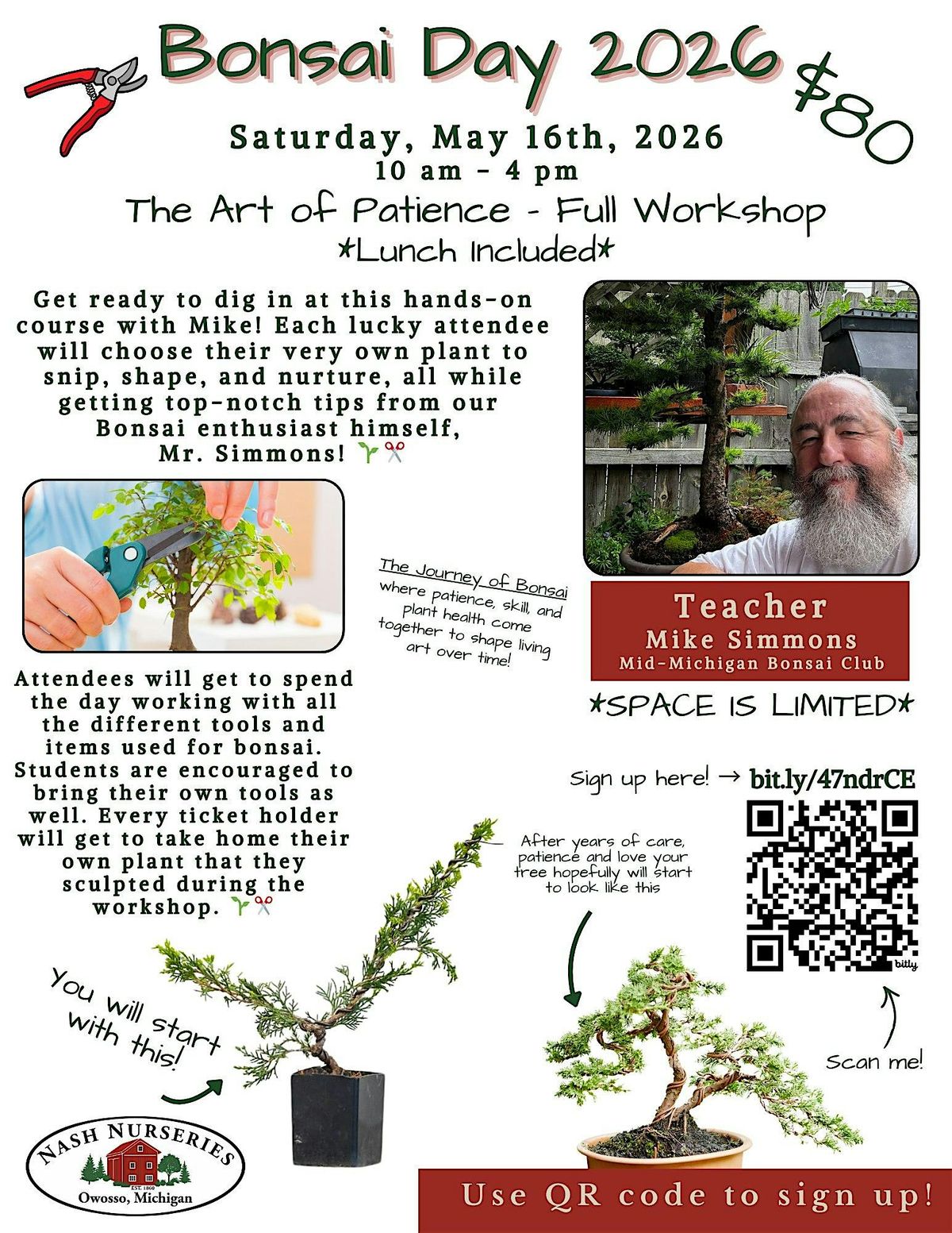 Join us for a hands-on bonsai workshop where you’ll learn the fundamentals of shaping and caring for your own living work of art. Guided by bonsai enthusiast Mike Simmons of the Mid-Michigan Bonsai Club, each participant will select their own plant and spend the day learning how to prune, shape, and nurture it into a bonsai.