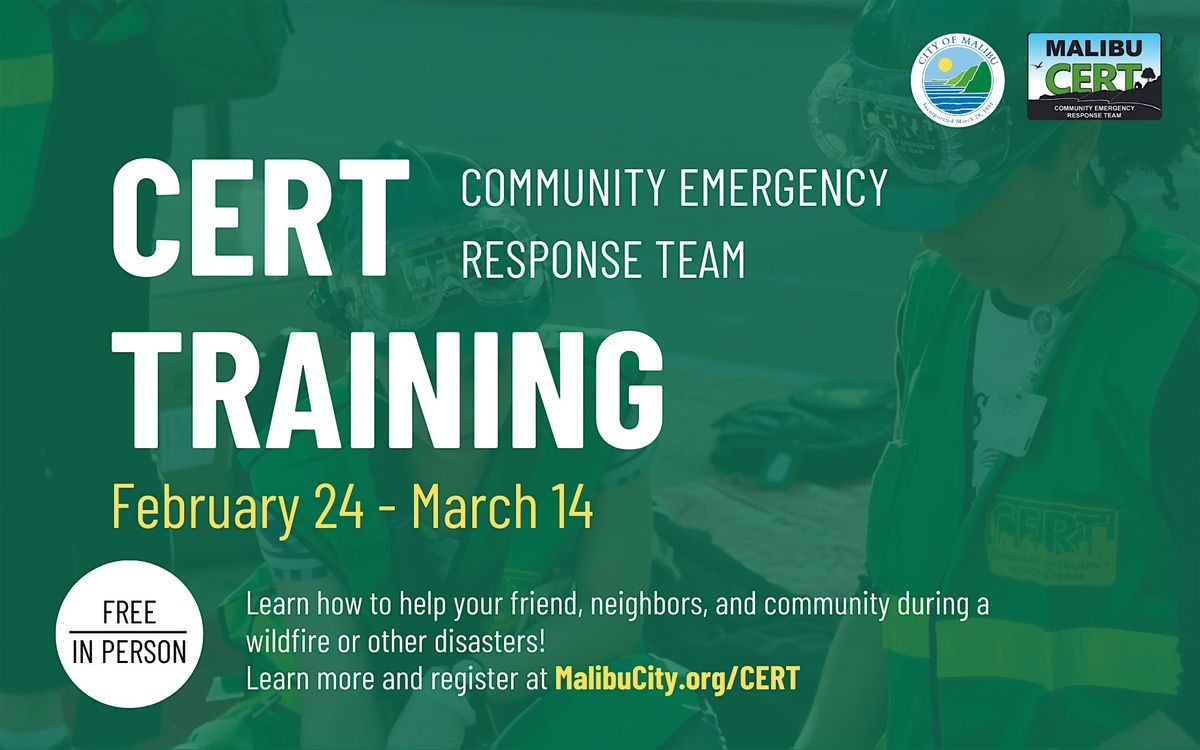 As part of its ongoing efforts toward community-wide preparedness, the City of Malibu is offering the next round of the highly popular Community Emergency Response Team (CERT) Training Course. The series of six classes will be held on Tuesday and Thursday evenings from 6:00 PM – 9:00 PM, February 24 through March 12 with the CERT Final Class/Drill happening on March 14 from 9:00 AM – 12:00 PM at Malibu City Hall, 23825 Stuart Ranch Road. When registering, you only need to register for the first class on the 6th in order to be registered for the series.